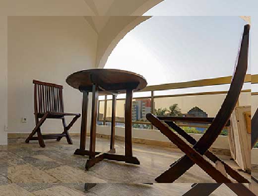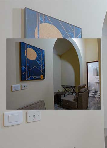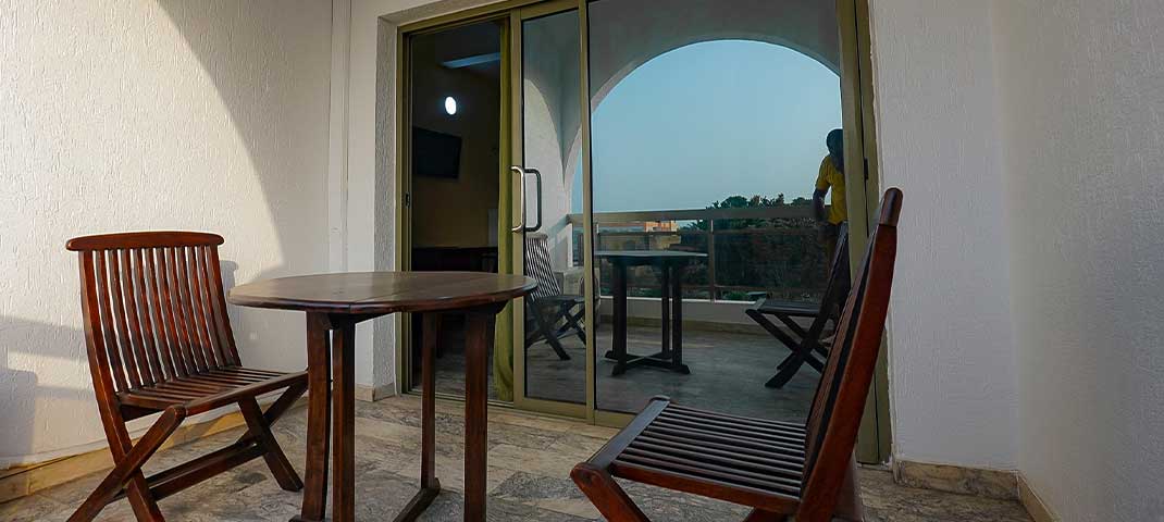 Our modern suite with a sea view features a bright living room with minimalist décor in shades