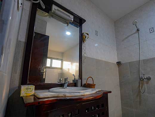mirror visually expands the space, while the light tiled floor and black accents add a touch of