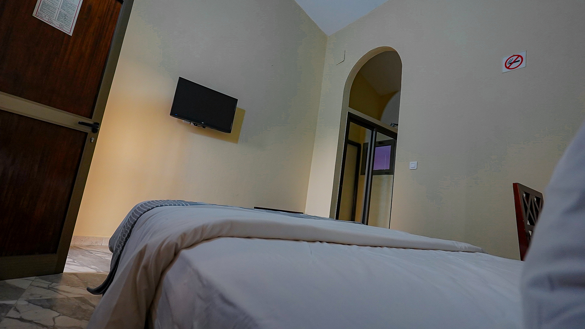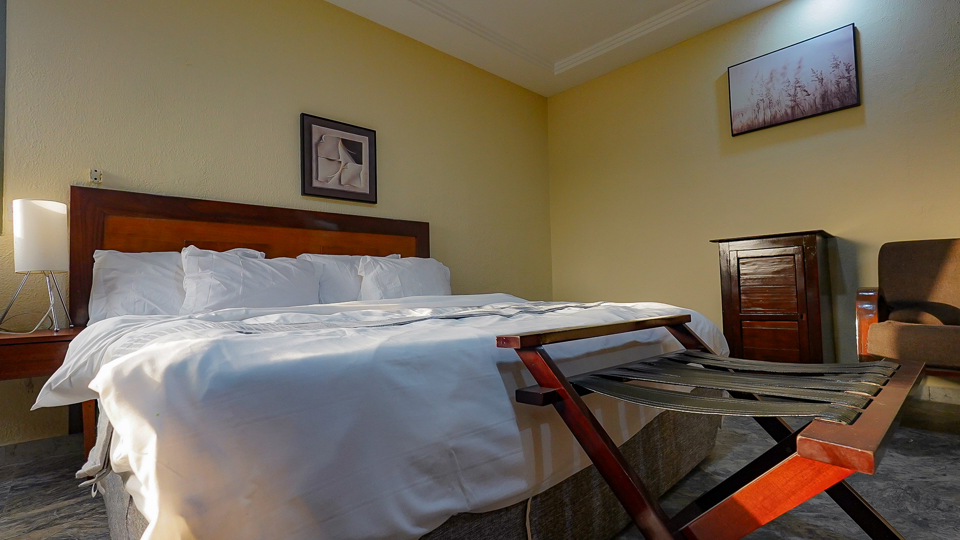 The sleeping area is equipped with a high-end king-size bed, dressed in basic-quality bedding to ensure