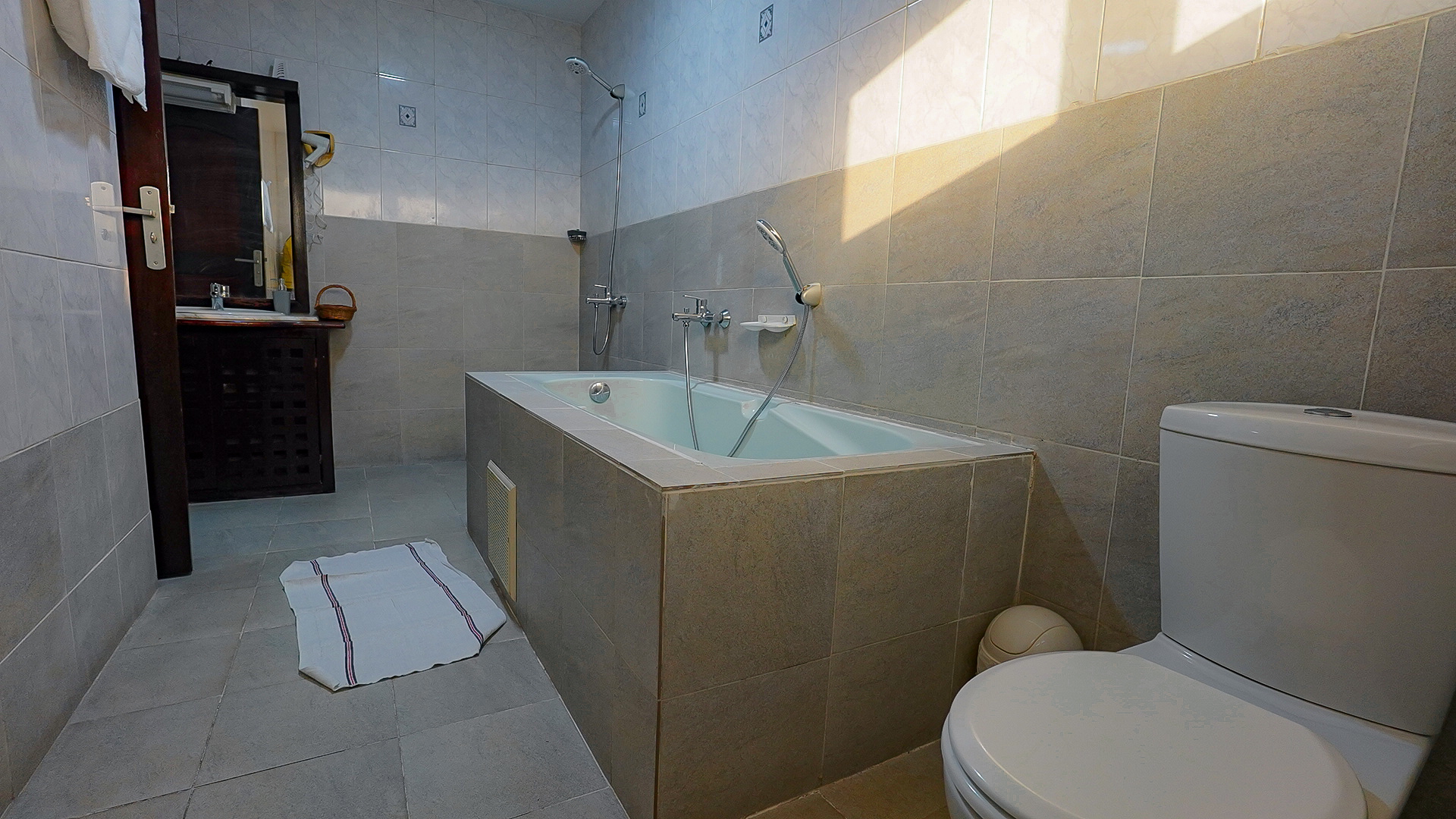 The Premium bathroom stands out for its spacious layout and natural light. It features an elegant bathtub with an